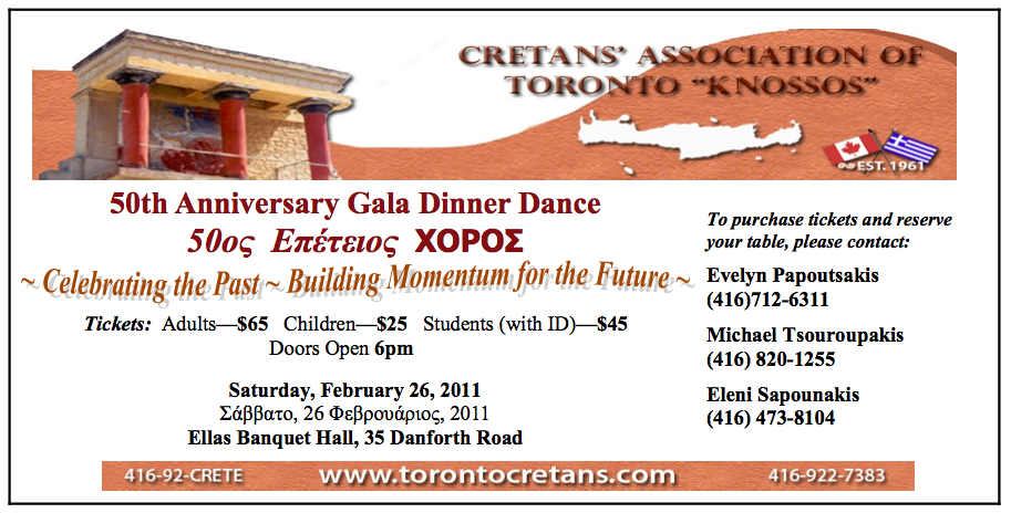 The Cretans’ Association of Toronto are celebrating 50 years of being an association in Toronto. In celebration of their 50 years, and in recognition of the Greek youth in our city, they are giving a discounted price to admission when you show your university or student ID. The event will be featuring live music directly from Crete (John Sisakis and his orchestra).