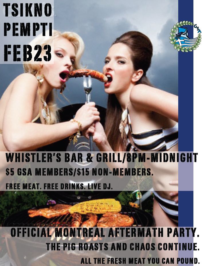 The GSA hosted its annual post-Montreal party while celebrating Τσικνοπέμπτη, a Greek tradition to grill meat before fasting begins, on February 23rd at Whistler’s Bar & Grill. The event was a huge success, as the venue was packed and students from all three universities enjoyed an abundant amount of souvlaki sticks, chicken strips, chicken wings, salad, drinks, and good music. The event cost $5 for UofT GSA members and $15 for non-members. The admission got each person one drink ticket, raffle ticket, and a buffet of all the delicious meat. Raffle prizes included GSA T-shirts and a grand prize of a GSA hoodie. Zeibekika and tsiftetelia accompanied by sfinakia followed soon after. Thank you all for coming out and supporting the GSA. A very special thank you to Steve Mastoras and the rest of the crew at Whistler’s Bar & Grill for providing the GSA with phenomenal service.