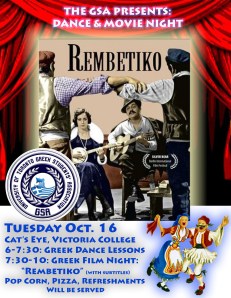 On Tuesday, October 16, the Greek Students Association held their first dance/movie night of the year in Cats Eye- Victoria College. Kalamatiano was taught during the dance portion, and after everyone indulged in pizza and refreshments, the film of the night, “Rembetiko”, was shown. This film is based on a true the true story of the popular singer Marika Ninou’s life, set in the 1920’s and manufactured into a musical drama and sweeps through 40 years. Those who attended the event were extremely enthusiastic towards both the Greek movie with English subtitles, and GSA’s popcorn machine. The GSA aspires to hold another similar event in the near future. Thanks go to all who attended, and for those who didn’t, not to worry! Undoubtedly more members will attend the next event, considering midterms were this week.