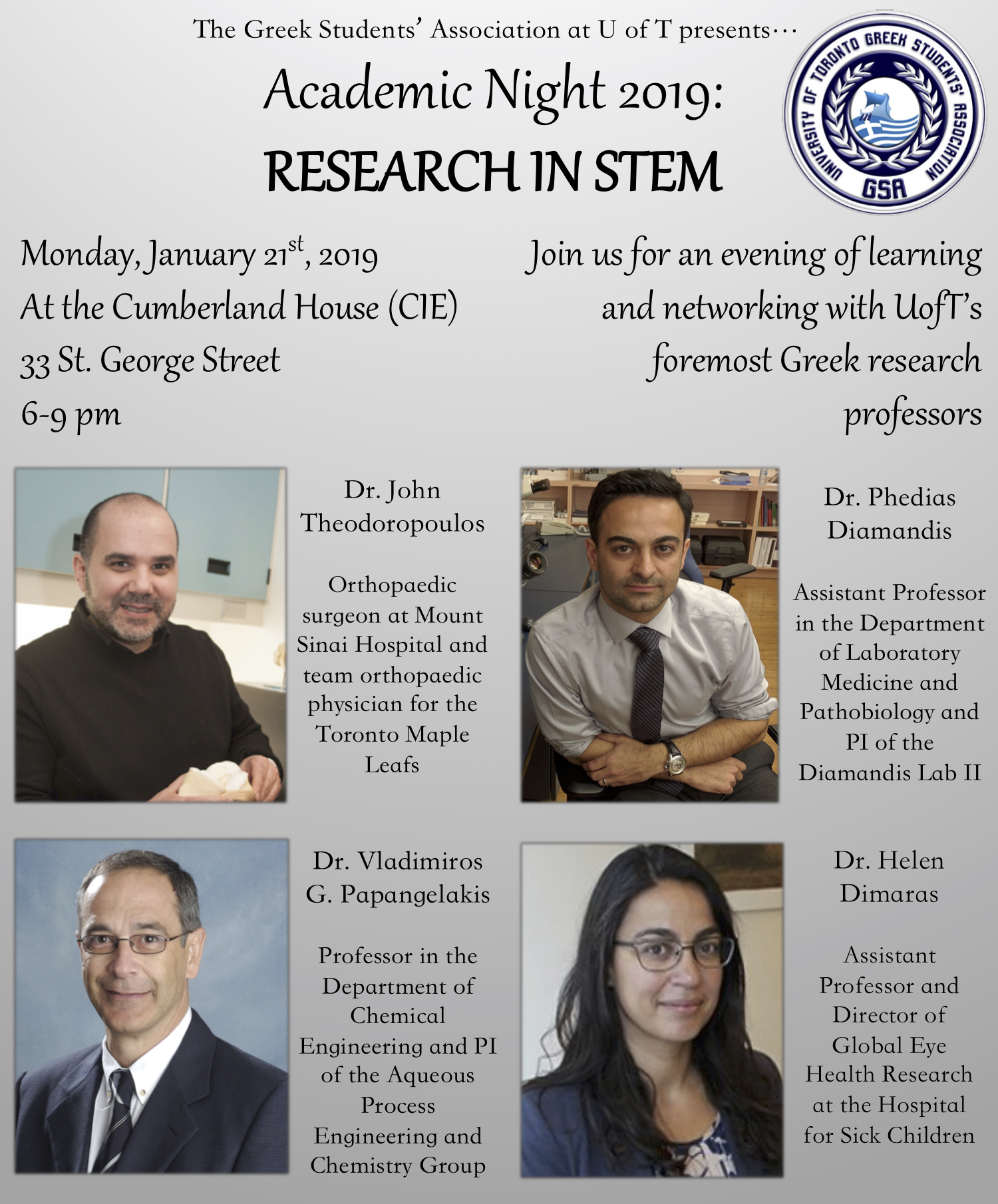Hello everyone! We are happy to announce an amazing event for students to learn about the fascinating research being conducted by Greek professors at UofT. This is an excellent opportunity to network, meet other students in the STEM field and interact with the professors firsthand. You do not want to miss this event, see you there!